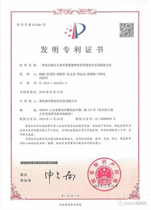 2020年11月24日,青島海洋新材料科技有限公司申請的《一種低壓縮永久變形聚氨酯彈性體填縫材料及其制備方法》發(fā)明專利獲得國家知識產(chǎn)權(quán)局授權(quán)。目前,公司共獲得國家授權(quán)專利32項,其中發(fā)明專利29項,實用新型專利2項,外觀設(shè)計專利1項。